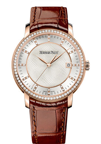 39mm 18K pink gold case, 9.00mm thick, sapphire back, 18K pink gold bezel set with 72 brilliant-cut diamonds; ~ 0.81 carat, sapphire crystal with glare-proof, silver-toned dial with pink gold applied hour-markers and hands, caliber 3120 self-winding movement with hours, minutes, center seconds, date, approximately 60 hours of power reserve, brown hand-stitched large square scale alligator strap, 18K pink gold pin buckle. Water resistant to 20 meters.